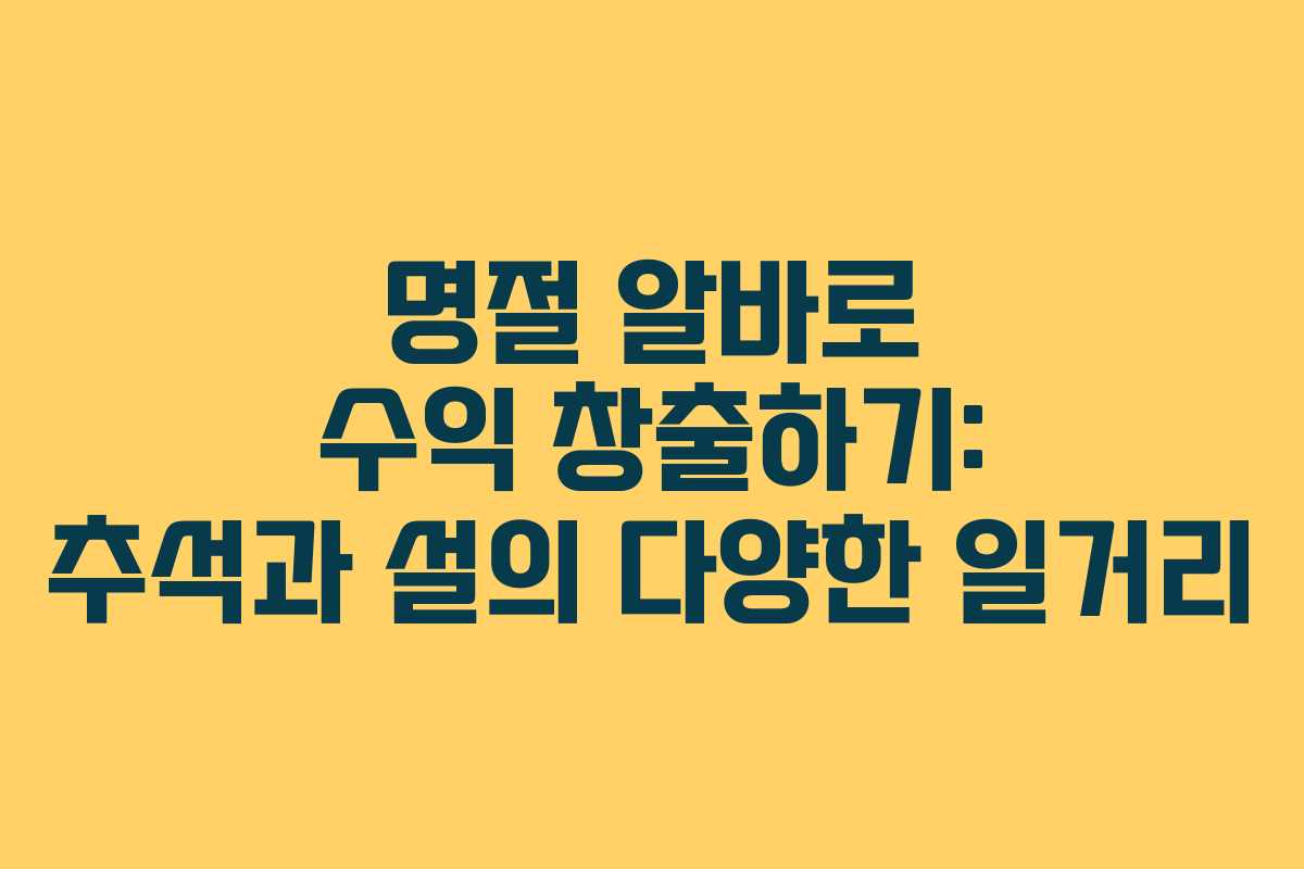 명절 알바는 가족과의 시간을 가지지 못하는 분들에게 좋은 기회를 제공하며, 소득을 올릴 수 있는 방법입니다. 다양한 선택지 중에서 본인에게 맞는 알바를 찾아보세요.