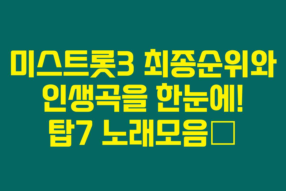 미스트롯3 팬 여러분! 미스트롯3 최종 순위 결과와 각 탑7의 인생곡을 만나보고 싶으신가요? 탑7의 매력적인 목소리와 함께 음악적 여정을 돌아보며 어떤 곡들이 인생곡으로 선정되었는지 확인해보세요! 멋진 무대와 감동의 순간들이 가득하답니다.