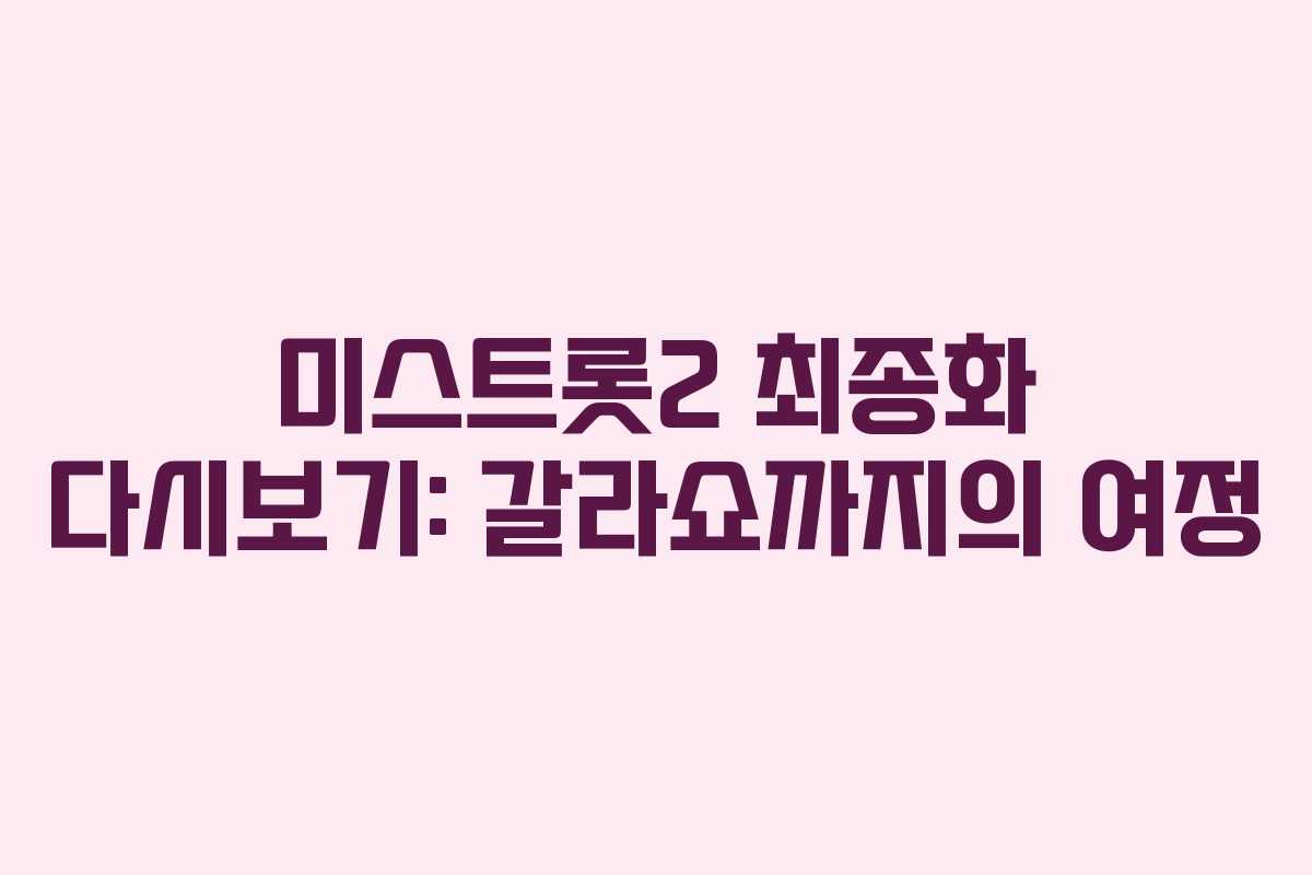 2021년 3월 4일, TV에서 방영된 ‘미스트롯2’의 최종회가 많은 팬들의 관심을 받았습니다. 결승 투표 공개 이후 제기된 조작 논란과 함께, 출연진들은 SNS를 통해 투표를 독려하며 관객들의 마음을 사로잡으려 했습니다. 이번 글에서는 최종화와 갈라쇼에 대한 내용을 정리해보겠습니다.