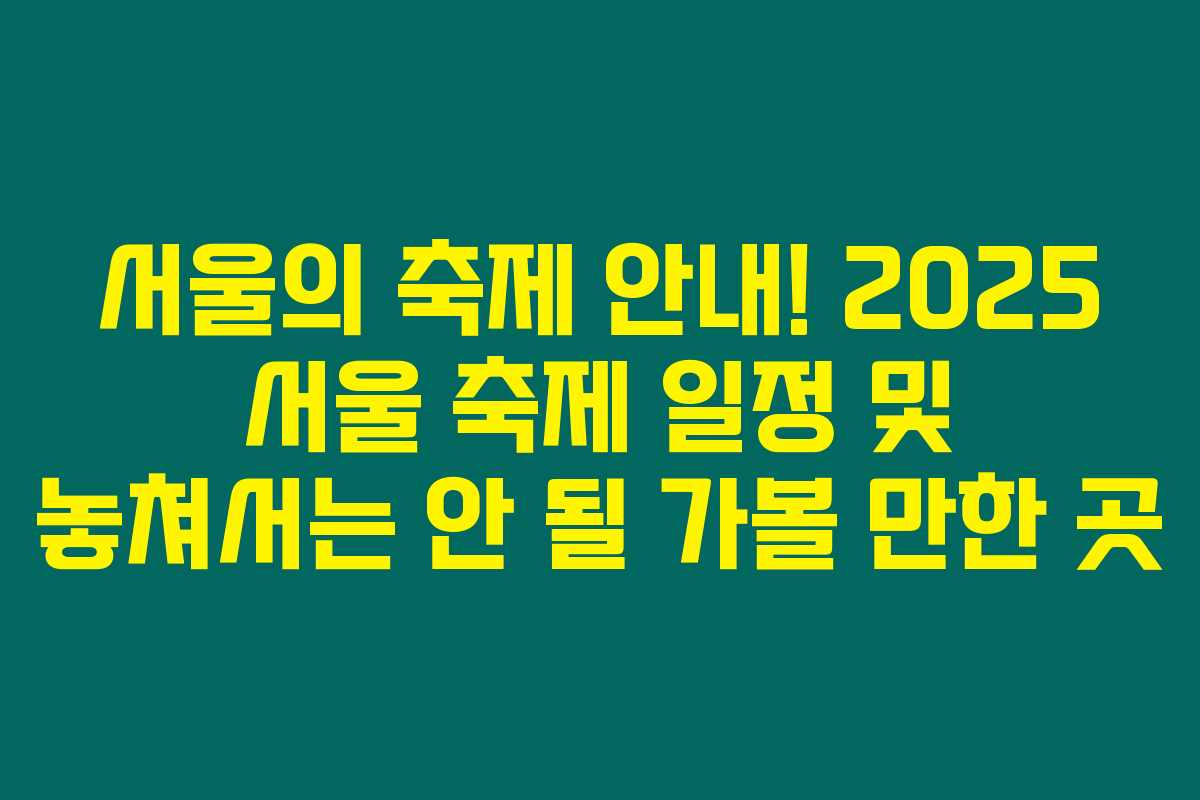 서울의 축제 일정은 계절마다 다채로운 매력을 지니고 있어요. 봄의 시작을 알리는 서울러너스페스티벌부터 여름의 광화문광장 야외오페라 그리고 가을의 서울세계불꽃축제, 겨울의 서울윈터페스타까지! 다양한 프로그램과 공연들이 여러분을 기다리고 있으니 2025년 서울의 축제를 놓치지 마세요!