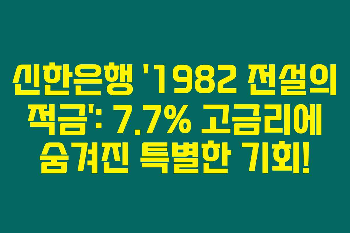 제가 알아본 바로는 신한은행이 새롭게 출시한 ‘1982 전설의 적금’은 단순한 금융 상품을 넘어 다양한 혜택과 이벤트로 가득 차 있어요. 이 적금은 최고 7.7%라는 높은 금리와 함께 가입자에게 흥미로운 이벤트들을 제공해, 저축의 재미를 더하고 있습니다. 아래를 읽어보시면 이 특별한 상품에 대해 자세한 내용과 가입 방법을 확인할 수 있을 겁니다.