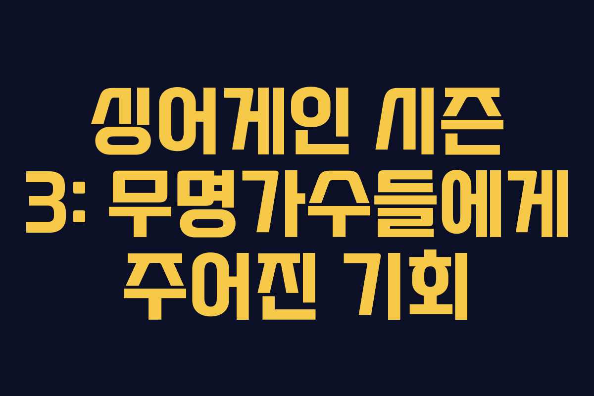 싱어게인 시즌 3는 무명가수들에게 새로운 기회를 제공하며, 그들의 꿈을 이루는 여정을 지켜보는 재미를 주는 프로그램입니다. 많은 관심과 응원 부탁드립니다!