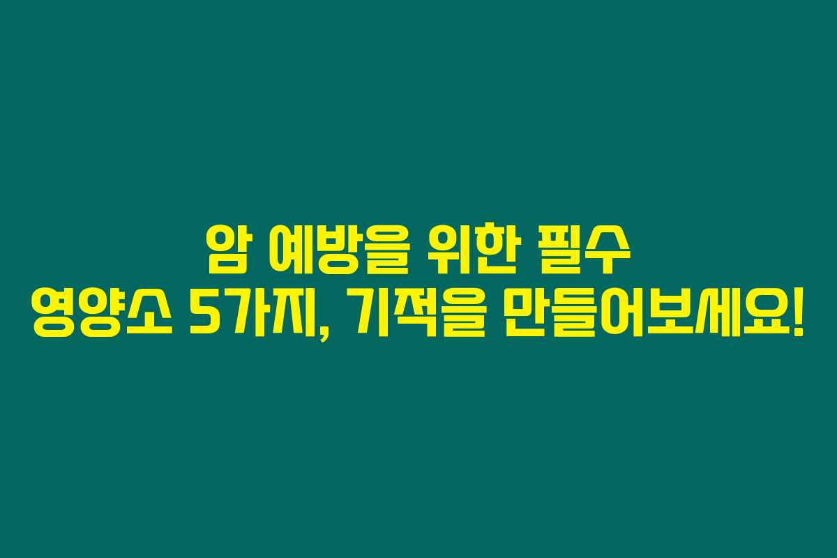 암 예방을 위해 어떤 영양소를 챙겨야 할지 고민하고 계신가요? “암 예방 필수 5가지 영양소”에 대해 잘 알고 계신가요? 만약 그렇지 않다면, 아래를 읽어보시면 건강한 삶을 위한 기적이 될 수 있는 영양소들에 대해 알아볼 수 있어요. 건강한 미래를 위해 꼭 체크해봐야 해요!