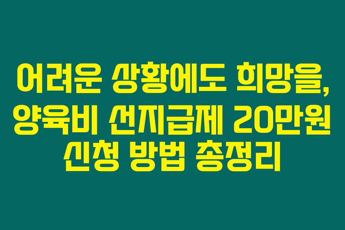 양육비 선지급제는 어려운 한부모 가정에게 큰 도움이 될 수 있는 제도입니다. 만약 자녀를 직접 양육하고 있으며, 양육비를 받지 못하고 계신다면 꼭 이 제도를 활용해 보시기 바랍니다. 필요한 서류를 챙겨서 온라인 또는 오프라인으로 신청하면, 20만원의 지원을 통해 생활이 한결 나아질 수 있습니다. 많은 이들이 도움받기를 바라며, 주변에 있는 분들에게도 이 정보를 공유하는 것이 좋겠어요.