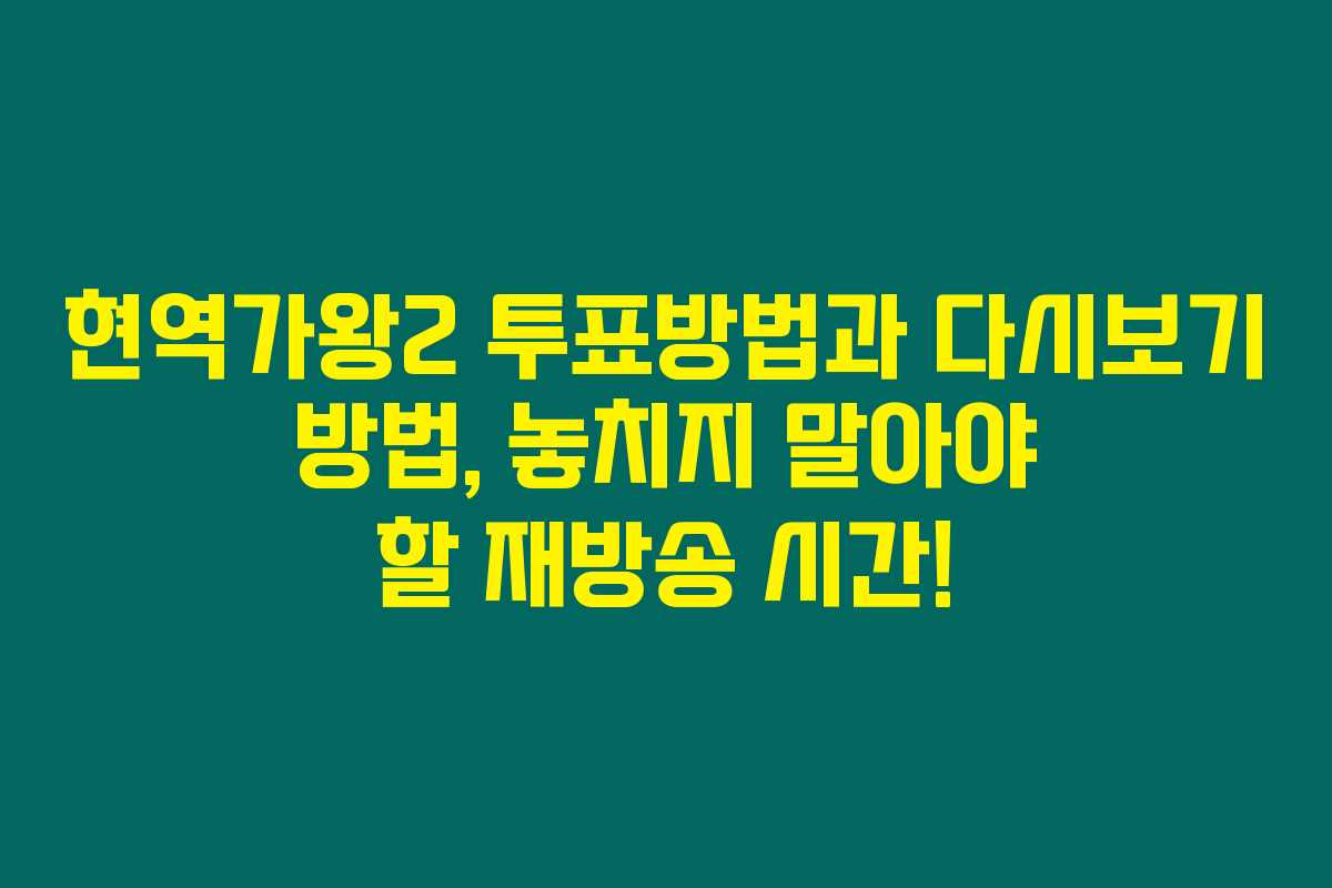 MBN에서 방영 중인 현역가왕2의 찬란한 무대와 흥미진진한 경쟁이 여러분을 기다립니다. 혹시 참여하고 싶은데 투표방법이 헷갈린다면, 아래를 꼭 확인해보세요. 현역가왕2의 투표 방법과 다시 보기 정보는 물론 재방송 시간도 알려드릴게요.