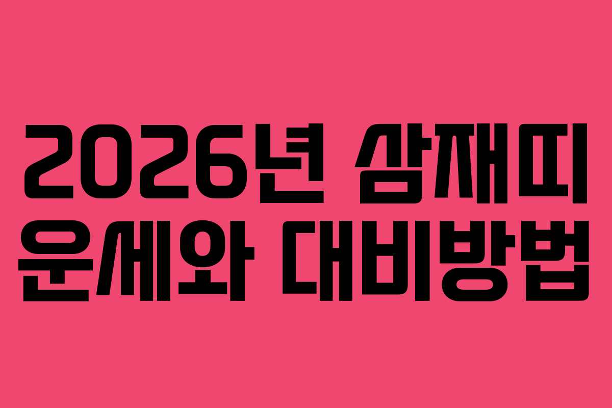 2026년 삼재띠에 해당하는 돼지띠, 양띠, 토끼띠는 신중하게 행동하고 중요한 결정을 미루는 것이 좋습니다. 삼재 부적과 기도를 활용하며, 재물과 건강 관리에 철저히 대비하여 불운을 최소화할 수 있습니다. 또한, 대박띠와 함께 긍정적인 마음으로 삼재를 지나가길 바랍니다.